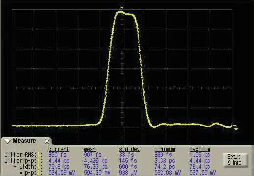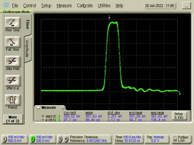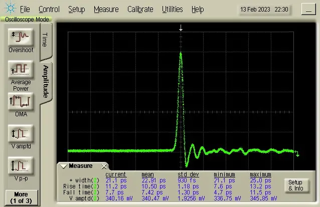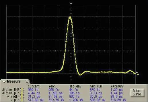 In modulator mode, optical pulse lengths of approx. 30 ps can be generated due to the high slew rate of 10 ps. Direct modulation by gain switching results in optical pulse widths of 30 to 60 ps, which can be compressed even further externally.