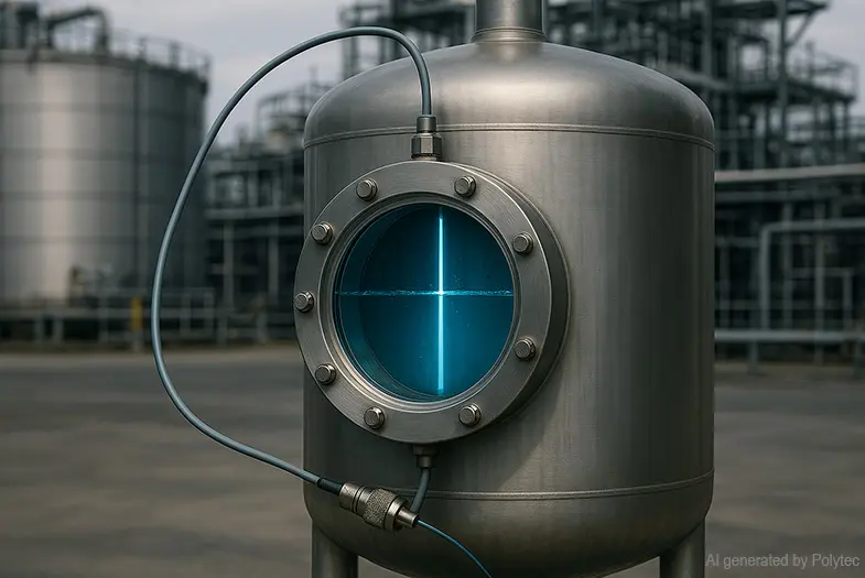The measurement principle is simple: the liquid level is calculated from the hydrostatic pressure exerted by the height of the liquid due to gravity. This pressure is determined using a patented technology based on optical Fabry-Pérot interferometry. This technology, known as WLPI (White Light Polarization Interferometry), operates using the phase modulation of light — the most sensitive method for fiber-optic measurements.