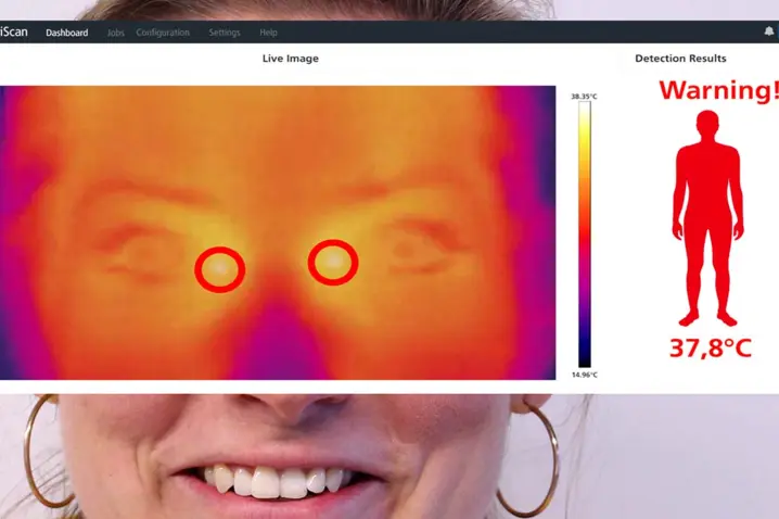 TI FeverScan is a solution for the detection of possible fever patients (e.g. corona-infected) based on high-precision temperature image evaluation (0.1°C accuracy). The access monitoring system with contactless temperature measurement can be quickly installed for use either temporarily in public places or as a stationary fixture in an entrance area. TI FeverScan consists of an intelligent IRSX infrared camera, a temperature reference body and a specially developed app. Further advantages: easy installation, fast measurement process (less than 1 second), mobile use. The result is shown graphically on the screen as a simple red-green display.