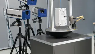 RoboVib® Bench permet l'analyse modale expérimentale automatisée de l'ensemble du corps à l'aide des vibromètres laser à balayage optique 3D de Polytec. Son matériel et son logiciel faciles à configurer s'intègrent parfaitement dans le flux de travail de mesure des vibrations par balayage de Polytec et permettent de gagner du temps en repositionnant automatiquement les dispositifs sous test (DUT) au lieu d'un déplacement manuel et fastidieux de l'installation du capteur. Les mesures sur 360° de l'objet à tester sont aussi faciles à réaliser qu'une mesure d'un seul côté.