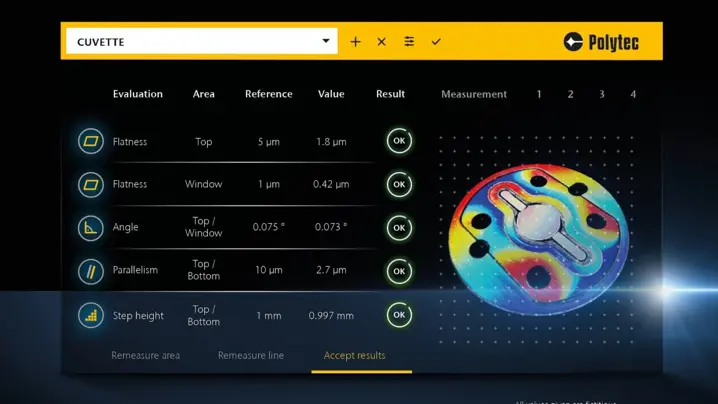 Very often, mechanical designs for workpieces include specifications for defined surface parameters such as surface roughness or ripple. Polytec TopMap surface metrology based on the white-light interferometry principle acquire entire non-contact 3D areal data in just seconds, where tactile methods would require much longer measuring times. Both 2D and 3D areal surface parameters (ISO 25178-2, ISO 4287, ISO 4288) – can be determined quickly and easily.