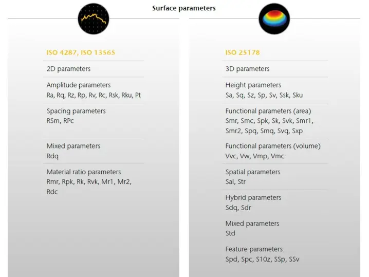 The mathematical description of numerous surface parameters can be found in various international standards. In practical application, ISO 4287 and ISO 13565 for 2D parameters and ISO 25178 for areal surface roughness are of particular importance. These standards define and describe the commonly used texture parameters.