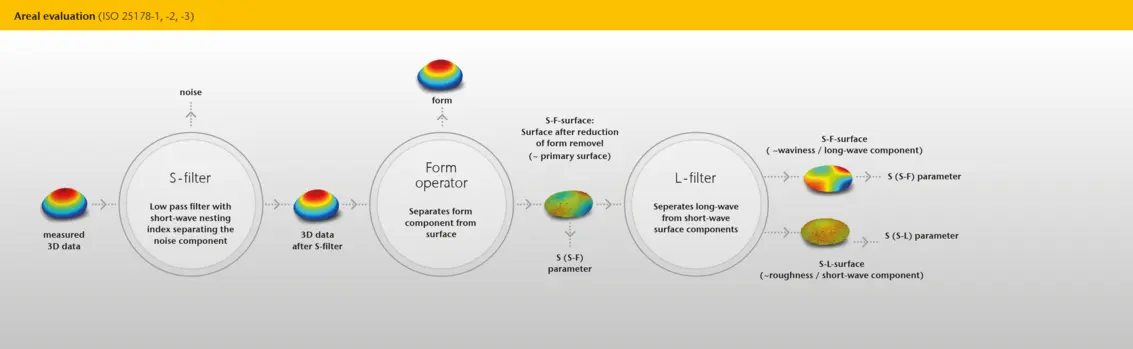 The measurement chains for the areal or profile-based surface evaluation are described in ISO 25178 or ISO 4287, they differ from each other with some details.