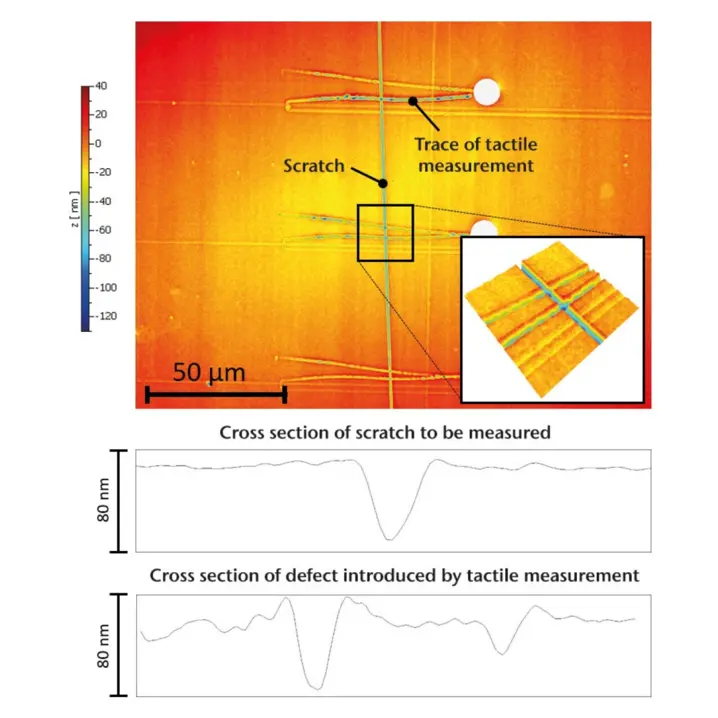 Furthermore, 2D profiles can easily be extracted from the areal measurement data which can again be evaluated according to the common rules of profile-based roughness evaluation. In contrast to a tactile roughness measurement, optical 3D roughness measurement is non-contact and non-reactive thus avoiding any damage or influence on sensitive surfaces by the measurement procedure.