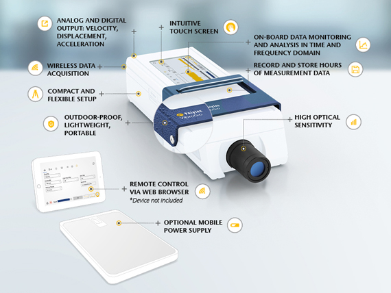 VibroGo® is the truly portable, battery powered laser vibrometer for field studies and quick and easy condition monitoring of machines and facilities on the go. This portable sensor detects noise and vibration and directly displays measurement data in the time and frequency domain. VibroGo® even allows on-board analysis in the field, while covering a wide frequency range of up to 320 kHz. Its outstanding resolution, with high linearity across the entire frequency range provides a handy precision analysis tool. Use VibroGo® for a better understanding of dynamics and acoustics in nature and technology - for research, product development and quality assurance.