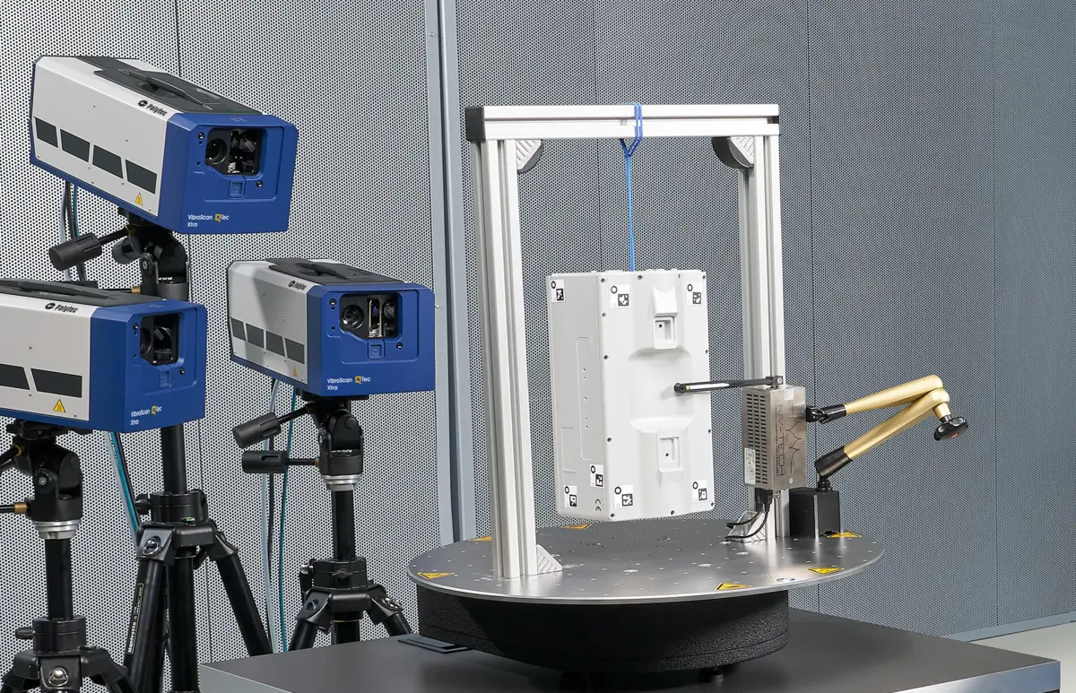 RoboVib® Bench 借助 Polytec 的光学三维扫描激光测振仪,让自动化、全方位的试验模态分析得以轻松实现。它的硬件安装简便,软件操作简易,能毫无障碍地融入 Polytec 的扫描振动测量工作流程之中。以往,手动重新布置传感器的工作既繁琐又耗时,而如今 RoboVib® Bench 可对被测设备(DUT)全自动重新定位,大大节省了时间成本。使用 RoboVib® Bench对被测设备进行 360° 全方位测量,就如同从单一方向进行测量一样不费吹灰之力 。